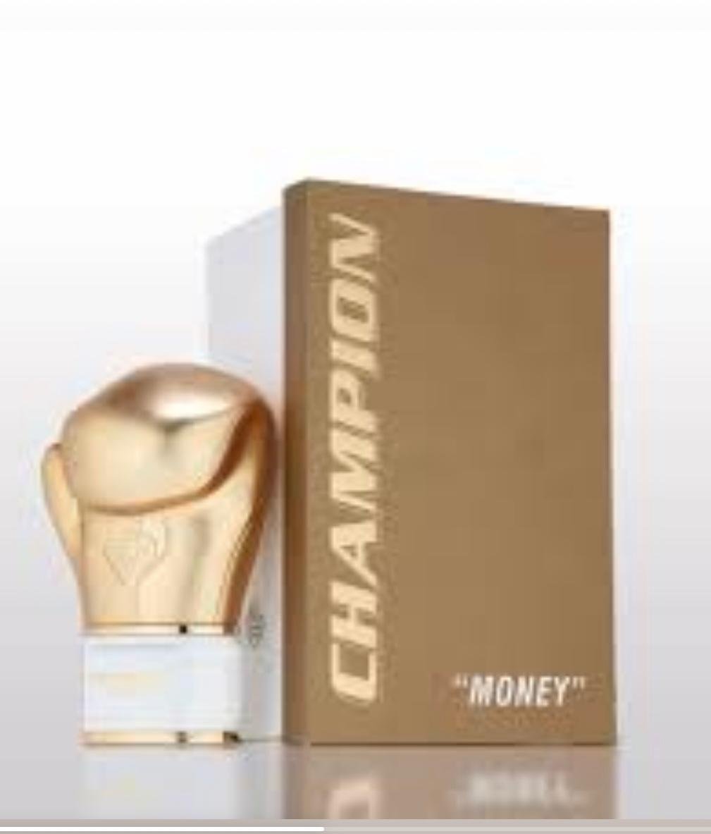 Una fragancia para hombre con una botella en forma de guante de boxeo dorado. El aroma, inspirado en el tema «Champion» y «Money», es probablemente una fragancia poderosa y masculina.