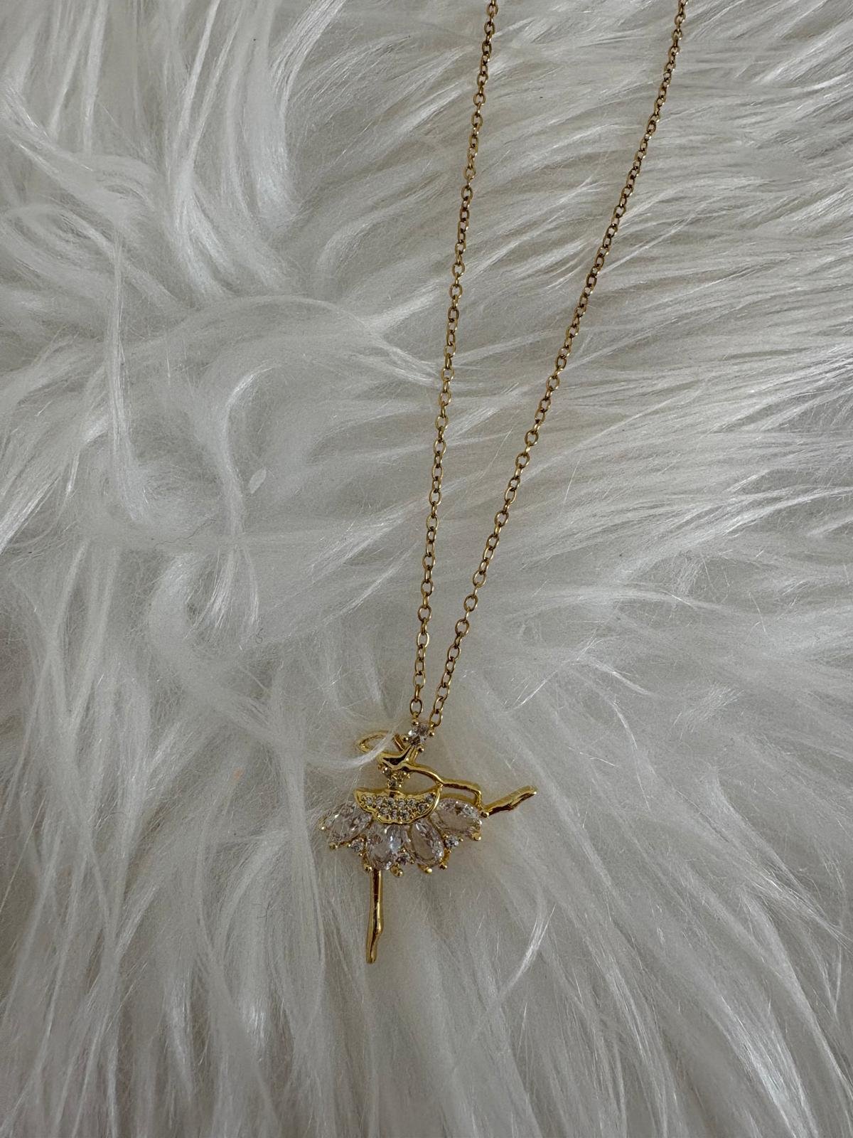 Este delicado collar dorado presenta un encantador colgante de una bailarina en posición de danza. Su tutu está adornado con brillantes zirconias, añadiendo un toque de gracia y elegancia, ideal para amantes del ballet o para un estilo sofisticado.